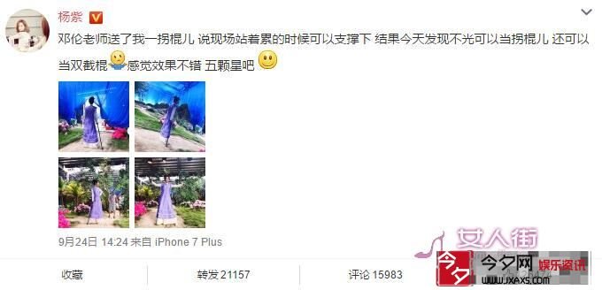 昨天下午,杨紫在微博po出了自己在片场手拄拐棍的照片,并指明这根拐棍为邓伦所送:“邓伦老师送了我一拐棍儿,说现场站着累的时候可以支撑下。结果今天发现不光可以当拐棍儿,还可以当双截棍感觉效果不错,五颗星吧。”