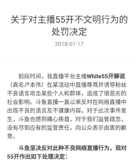 前段时间,我直播平台主播White55开解说(真名卢本伟)在某活动中直播辱骂并诱导粉丝不良语言攻击某些个人和群体,造成了很恶劣的社会影响。斗鱼直播一直以来反对在网络直播中出现不良的语言及不健康内容。对于此次事件发生,斗鱼也感到痛心疾首,对于我们监管疏忽,没有尽到应有的监管责任,向公众表示由衷的歉意。