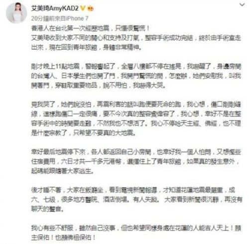 声称为悭钱、以港币一千多元租住青年旅馆六日的艾美琦,说在昨晚十一时许感受到地震,她说:‘警报响起了,全层八楼都不停在摇晃,我吓醒了,身边房间的台湾人、日本学生们也开了门,我开门惊慌的问,怎么办,她们安慰我,叫我开着门,穿鞋取重要物品,说不用怕,我吓得大哭。见我哭了,她们说没怕,再震利害的话叫跑便要死命的跑,我心想,伤口刚刚缝线,这样跑伤口一定很痛,要不今次真的整容变伟容了,我心想,幸好不是在整容手术中的时间要走难,不然我也不想活了。我心不停念天主经、佛经,也不理是甚么宗教了,只希望不要真的大地震。