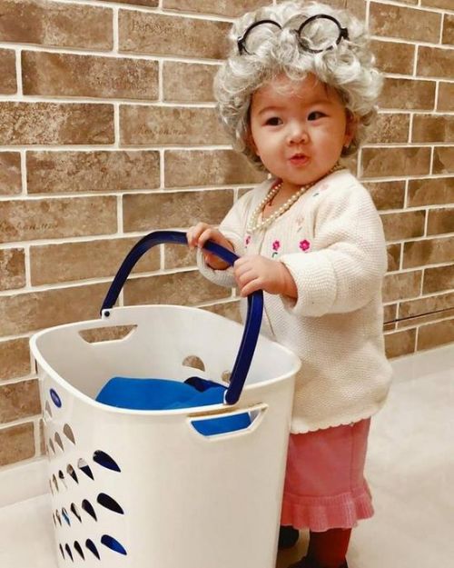 贺军翔在脸书公开一张照片,见美宝头戴卷短假发,头上还挂着粗框圆眼镜,穿着绣着小花图案的白上衣、配粉色鱼尾裙,脖子还戴着珍珠项链,手握着洗衣篮的把手,扮成贵妇奶奶,让他发文写道:“不知不觉美宝也老了~(1岁整)祝福她Happy 1st birthday,身体健康最重要。”